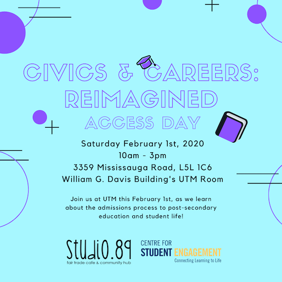 Program DetailsDeveloped by Studio.89’s own Youth Social Justice Team and UTM’s Centre for Student Engagement, ‘Civics & Careers Reimagined’ is an event series geared towards educating students on post-secondary life.